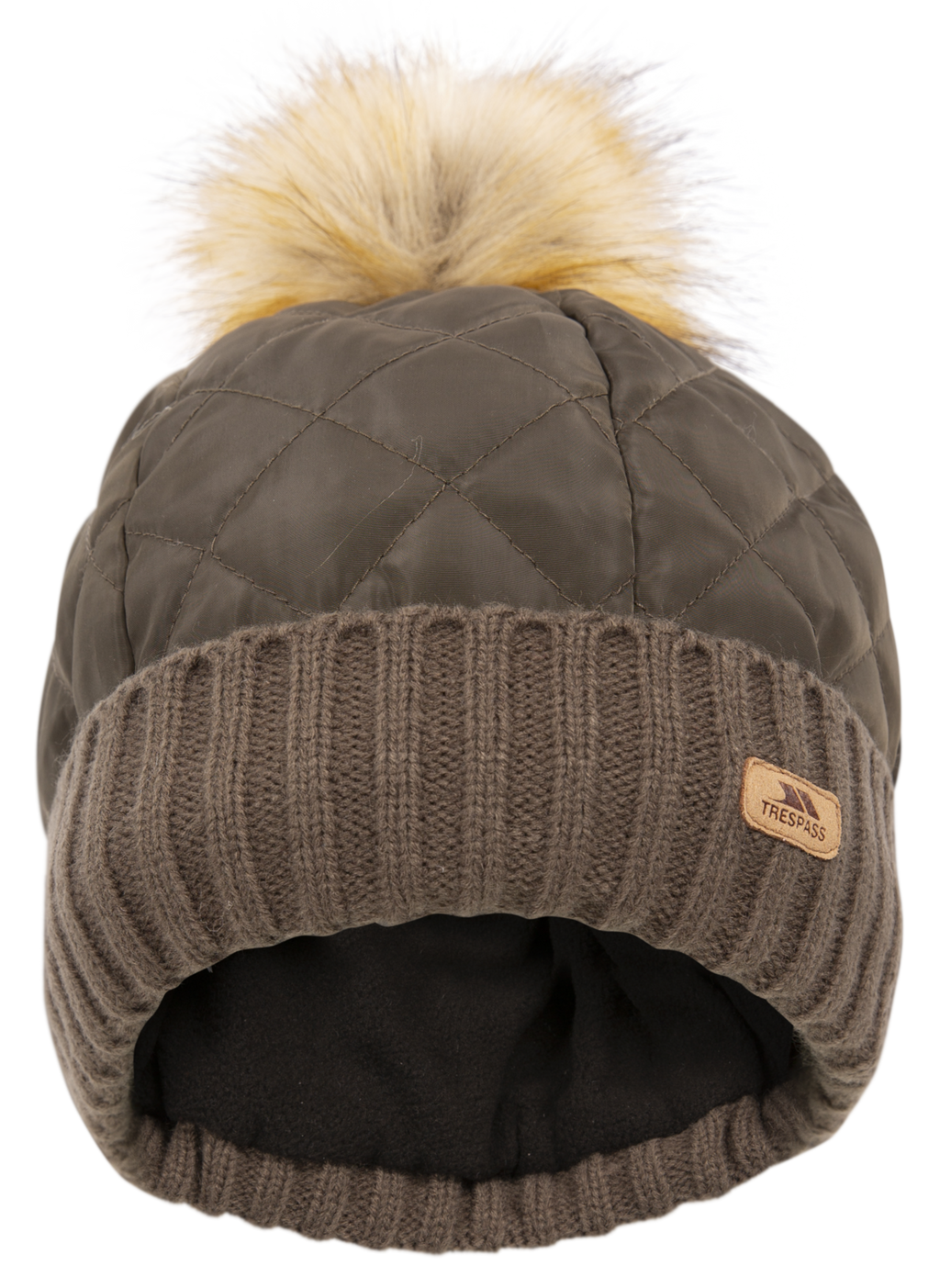 Pom-pomleatherette badgequilted fabric and knitted hat