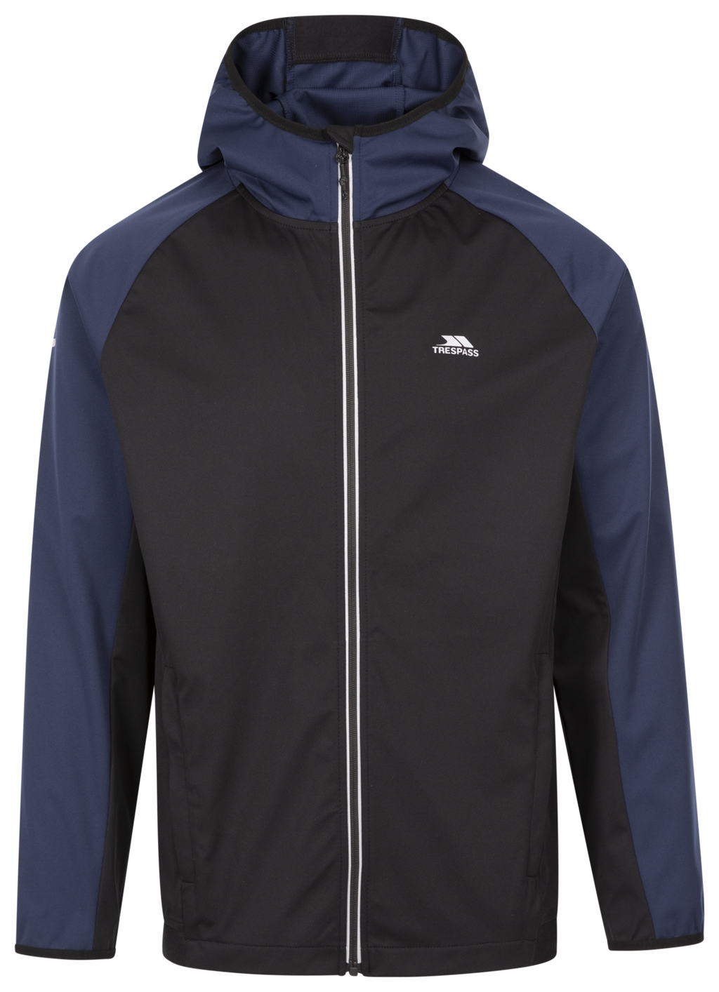 Raglan sleevesfull zip on c/freflective print on zip tape2 zip pocketscontrast panelsreflective trespass logobranded eastic on hem and hood