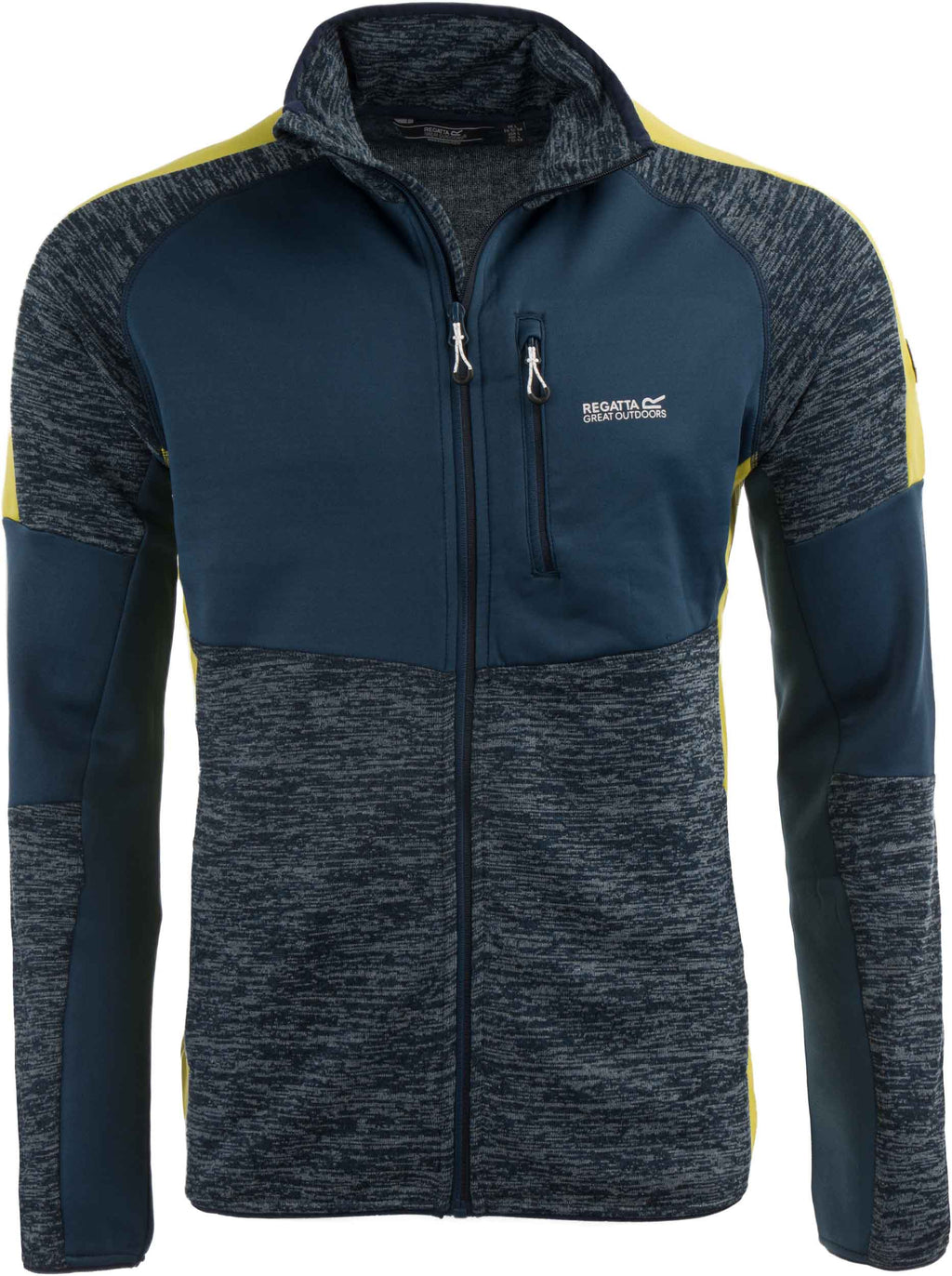 Regatta Męska Bluza z kapturem Regatta Coladane II Światło księżyca/ciemna niebieska bluza z żółtymi paneli wykonana jest z wysokiej jakości materiałów, które nie wchłaniają wody, wyctują się od ciała i szybko suszą. Bluza z pełnej długości polaru ma panele rozciągające na bokach, dwie boczne kieszenie i jedną kieszeń na klatkę piersiową z długimi ciągnięciami dla lepszego obsługi zamka. Wyższy kołnierz z główną osłoną zamka, aby zapewnić bezpieczeństwo podbródka przed żywiołami. Rękawy i na dole są wyposażone w elastyczną gumę, aby zapobiec dmuchaniu zimnego powietrza pod bluzą i zapewnić najlepszy możliwy komfort cieplny. W przypadku miłośników sportu, wędrówek i dowolnego innego ruchu jest idealny i powinien być w twoim sprzęcie jako warstwa podstawowa lub warstwa środkowa pod kurtką w chłodniejszych klimatach. Wygodna bluza jest ozdobiona logo marki. Materiał: 85% poliester, 13% wiskozy, 2% elastanu