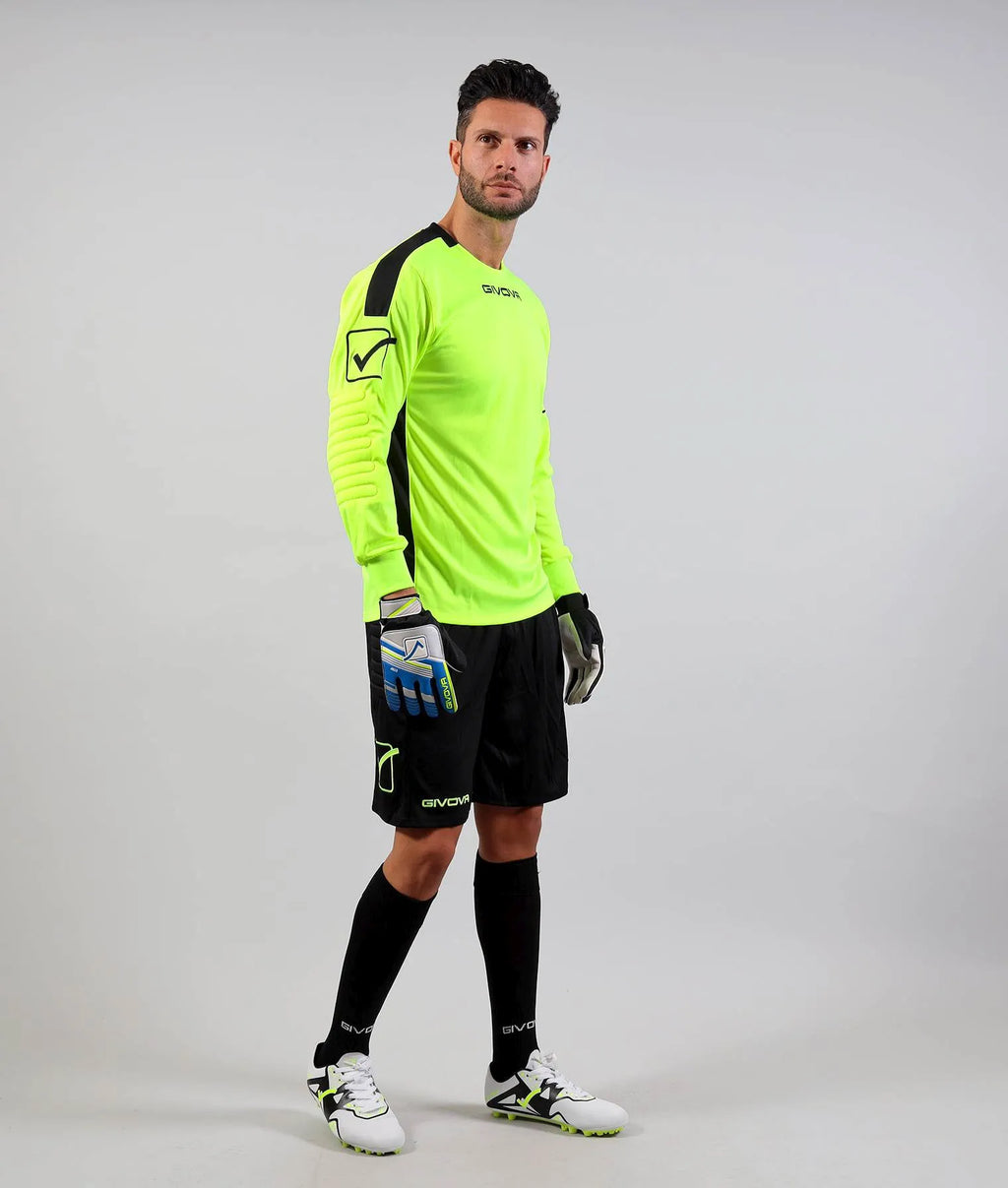 Givova goalkeeper set consisting of a long-sleeved jersey and shorts the givova portiere hyguana goalkeeper set (code kitp009) consists of a long-sleeved jersey and shorts. The polyester material is quick-drying and breathable. On the sides you will find reinforced sides that soften the impact. The set is decorated with a number of elements in the form of givova brand logos. Material: 100% polyester