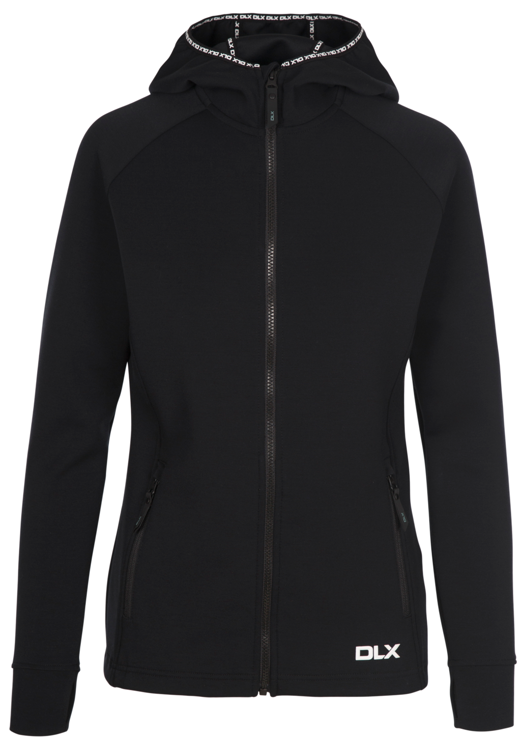 Cremallera frontal completa en la capucha 2 bolsillos con cremallera Ribete de marca en la capucha Agujeros para el pulgar Logotipo impreso